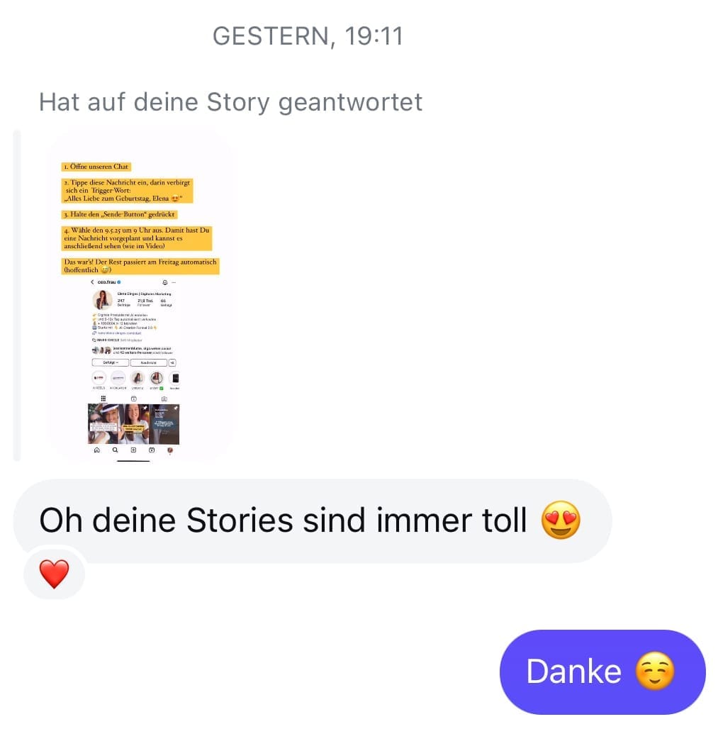 Ein Video im Kurs zeigt dir Schritt für Schritt, wie du aus deiner Story einen automatisierten Verkaufsprozess baust. Entweder manuell gespeicherte Nachrichten oder im besten Fall mit Manychat vollständig automatisiert. Kein Vorwissen nötig.