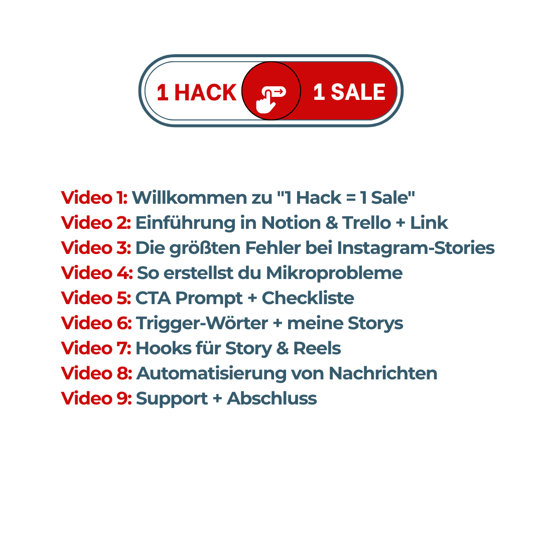 Nachdem deine Zahlung bearbeitet wurde, erhältst du einen Link per Mail, der dich direkt zum Onlinekurs "1Hack = 1Sale für Storys" führt, damit du sofort starten kannst deine Story zu erstellen, die verkaufen!